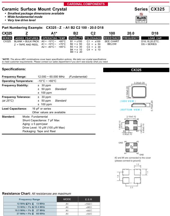 更多>>美國卡迪納爾晶振,CX325無源晶體,CX325-Z-A2B9C4100-20.0D20晶振