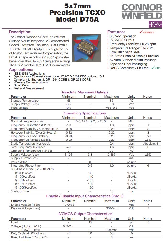 更多>>康納溫菲爾德晶振,D75A晶振,TCXO晶振