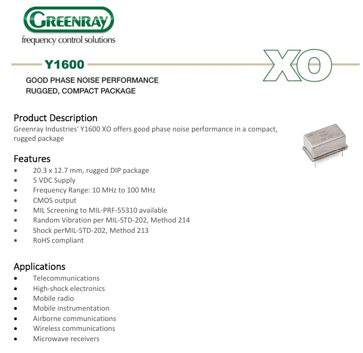 在應(yīng)用領(lǐng)域方面,格林雷晶振Y1600 XO有源晶振展現(xiàn)出了強大的適應(yīng)性.在電信領(lǐng)域,它為信號的穩(wěn)定傳輸提供了保障,確保通話清晰、數(shù)據(jù)傳輸準確無誤.對于高沖擊電子設(shè)備,其堅固的封裝和出色的穩(wěn)定性使其成為不二之選,能夠在受到強烈沖擊時依然正常工作.在移動無線電和移動儀器中,該晶振的低功耗和寬頻率范圍特性,為設(shè)備的小型化和高性能化提供了可能.在航空通信領(lǐng)域,其嚴格的軍用篩選標準,保證了在高空復(fù)雜環(huán)境下通信的可靠性.在無線通信和微波接收器中,它又憑借良好的相位噪聲性能,提高了信號的接收質(zhì)量.