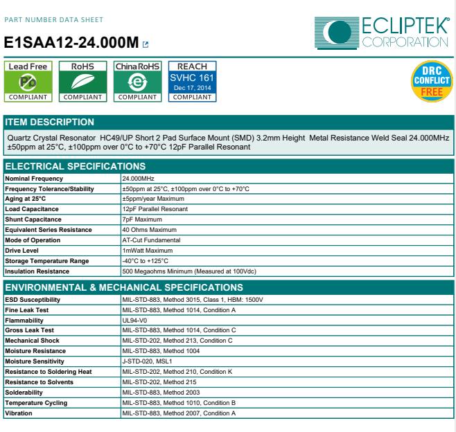 | EA5070NA24-6.000M | AT-Cut Fundamental | SMD Ceramic 5.0mm x 7.0mm | ±15ppm | 0°C to +70°C | ±3ppm | 7pF Maximum |