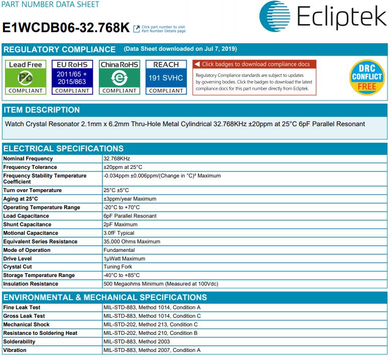 日蝕晶振E1WC,E1WCDB06-32.768K石英插件晶振, Ecliptek晶振,歐美晶振,石英晶體,音叉晶體,無源晶振,圓柱晶振,32.768K晶振型號E1WC,E1WCDB06-32.768K是一款圓柱型金屬面的插件晶振,尺寸為2060mm,頻率32.768KHZ,精度20ppm,負載電容10pF,工作溫度-20~+70°C.具備高性能的特點,比較適合用于兒童玩具,錄音筆等領(lǐng)域.
