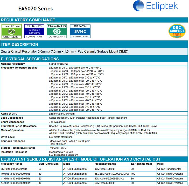 | EA5070KA12-6.000M | AT-Cut Fundamental | SMD Ceramic 5.0mm x 7.0mm | ±15ppm | 0°C to +70°C | ±3ppm | 7pF Maximum |