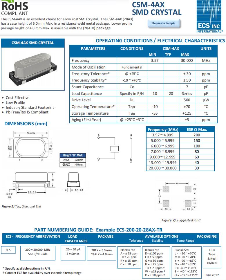 | ECS-40-20-28AX-TR | ECS晶振 | CSM-4AX | 4MHz | -10°C ~ 70°C |