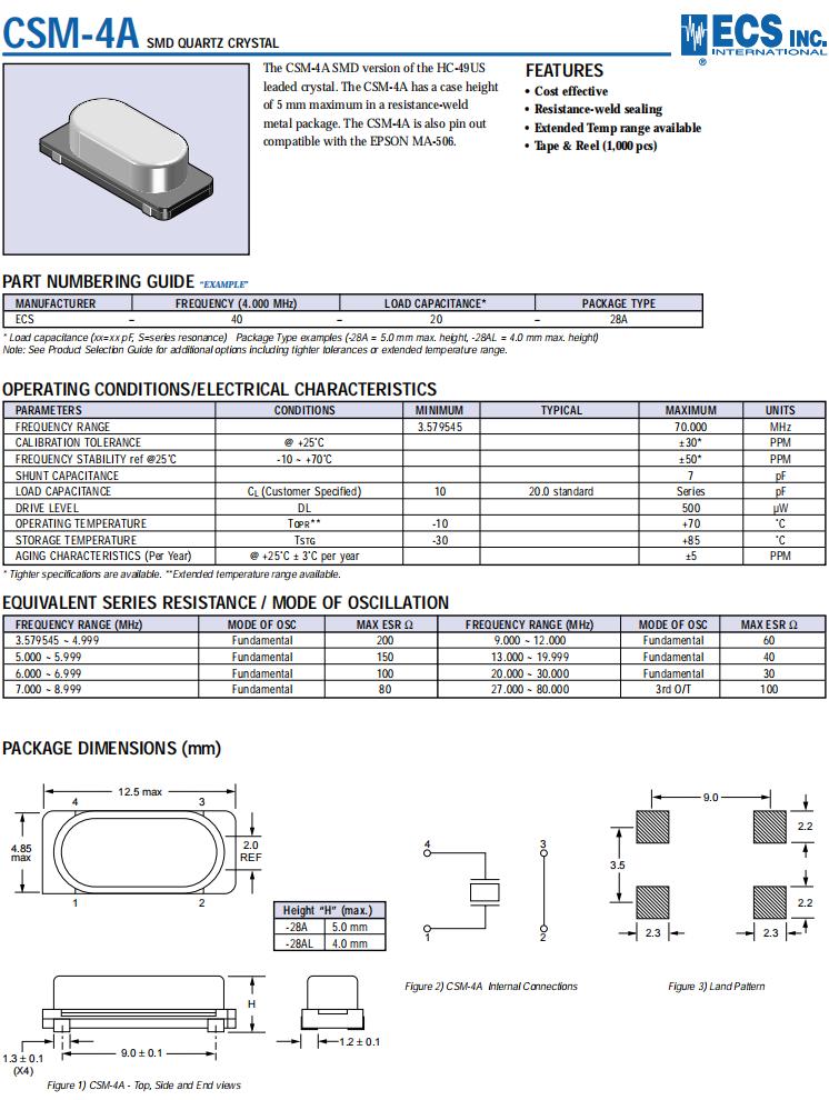 ECS-240-12-28A-TR,CSM-4A,24MHz,ECS無(wú)源晶振,車載晶振,美國(guó)進(jìn)口晶振,伊西斯晶振,ECS晶振,型號(hào):CSM-4A,編碼為:ECS-240-12-28A-TR,頻率:24.000MHz,工作溫度范圍:-10℃至+70℃,小體積尺寸:12.5x4.85mm橢圓形SMD封裝,四腳貼片晶振,無(wú)源晶振,石英晶振,石英晶體諧振器,SMD晶振。CSM-4A SMD版本的HC-49US含鉛晶體,CSM-4A在電阻焊金屬封裝中的外殼高度最大為5mm。CSM-4A也被確定與EPSON MA-506兼容。適用于:移動(dòng)通訊設(shè)備,無(wú)線網(wǎng)絡(luò)晶振,藍(lán)牙模塊晶振,車載晶振,數(shù)碼電子晶振,物聯(lián)網(wǎng)等應(yīng)用。