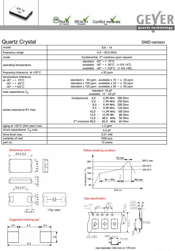 GEYER歐美進(jìn)口晶振,KX-14無(wú)源晶振,SMD晶體,貼片石英晶振最適合用于車載電子領(lǐng)域的小型表面貼片石英晶體振蕩器.也可對(duì)應(yīng)有高可靠性要求的引擎控制用CPU的時(shí)鐘部分簡(jiǎn)稱為時(shí)鐘晶體振蕩器,在極端嚴(yán)酷的環(huán)境條件下也能發(fā)揮穩(wěn)定的起振特性,產(chǎn)品本身具有耐熱,耐振,耐撞擊等優(yōu)良的耐環(huán)境特性,滿足無(wú)鉛焊接的回流溫度曲線要求,符合AEC-Q200標(biāo)準(zhǔn).