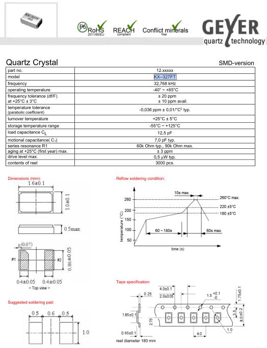 GEYER晶振,KX–327FT無源晶體,32.768K晶振,貼片表晶32.768K系列千赫晶體KHZ具有超小型,薄型,質(zhì)地輕的表面貼片音叉型石英晶體振蕩器,晶振產(chǎn)品本身具備優(yōu)良的耐熱性,耐環(huán)境特性,在辦公自動化,家電領域,移動通信領域可發(fā)揮優(yōu)良的電氣特性,符合無鉛標準,滿足無鉛焊接的回流溫度曲線要求,金屬外殼的石英晶振使得產(chǎn)品在封裝時能發(fā)揮比陶瓷晶振外殼更好的耐沖擊性能.
