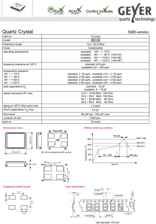 GEYER進口晶振,KX-6藍牙耳機晶振,SMD無源晶振,小型貼片石英晶振,外觀尺寸具有薄型表面貼片型石英晶體振蕩器,特別適用于有小型化要求的市場領(lǐng)域,比如智能手機,無線藍牙,平板電腦等電子數(shù)碼產(chǎn)品.晶振本身超小型,薄型,重量輕,晶體具有優(yōu)良的耐環(huán)境特性,如耐熱性,耐沖擊性,在辦公自動化,家電相關(guān)電器領(lǐng)域及Bluetooth,WirelessLAN等短距離無線通信領(lǐng)域可發(fā)揮優(yōu)良的電氣特性,滿足無鉛焊接的回流溫度曲線要求.