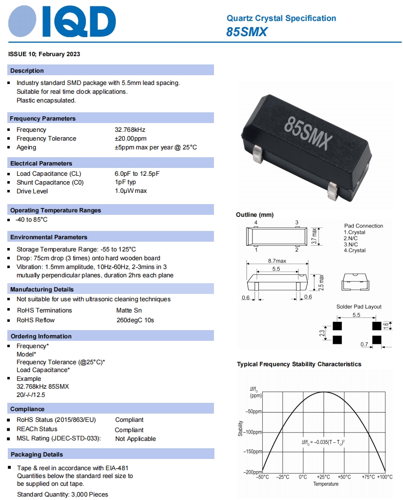 IQD音叉晶振,85SMX千赫晶體,6G相關(guān)設(shè)備晶振規(guī)格表