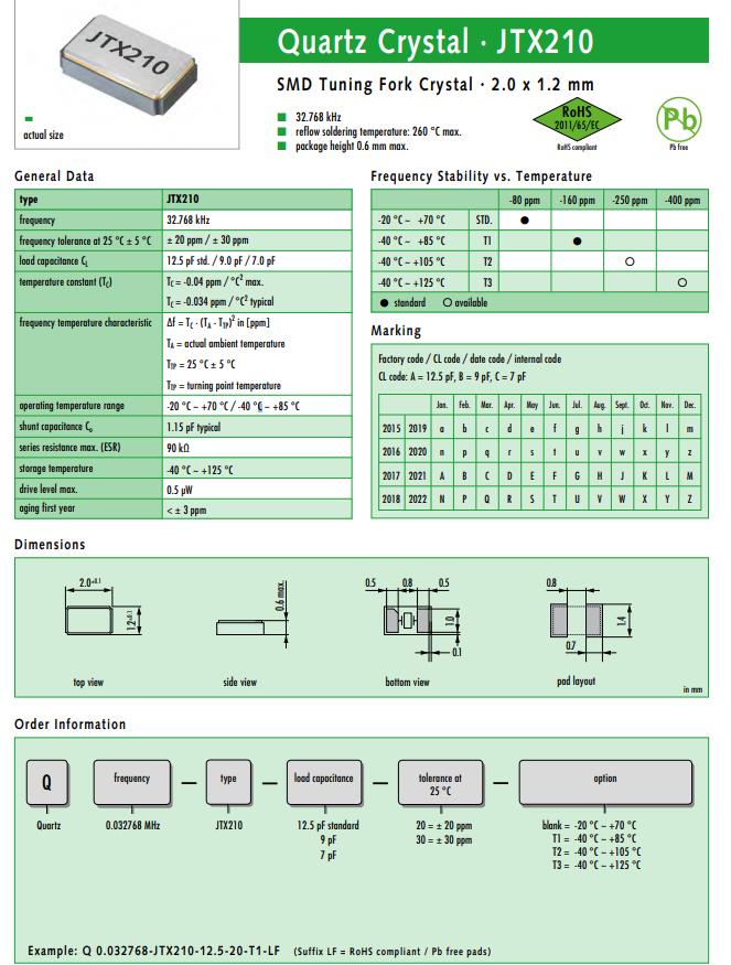 | Q 0.032768-JTX210-12.5-20-T2-LF | JTX210 | 32.768kHz | ±20ppm | 12.5pF |