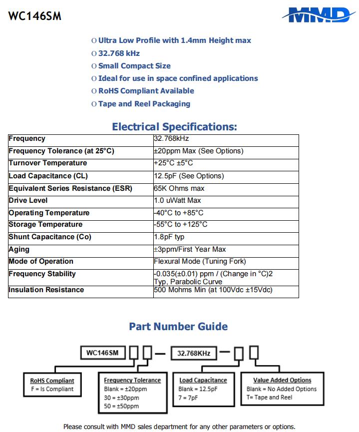 麥迪康進口晶振,WC146SMF-32.768KHZ-T,6G基站晶振規(guī)格表