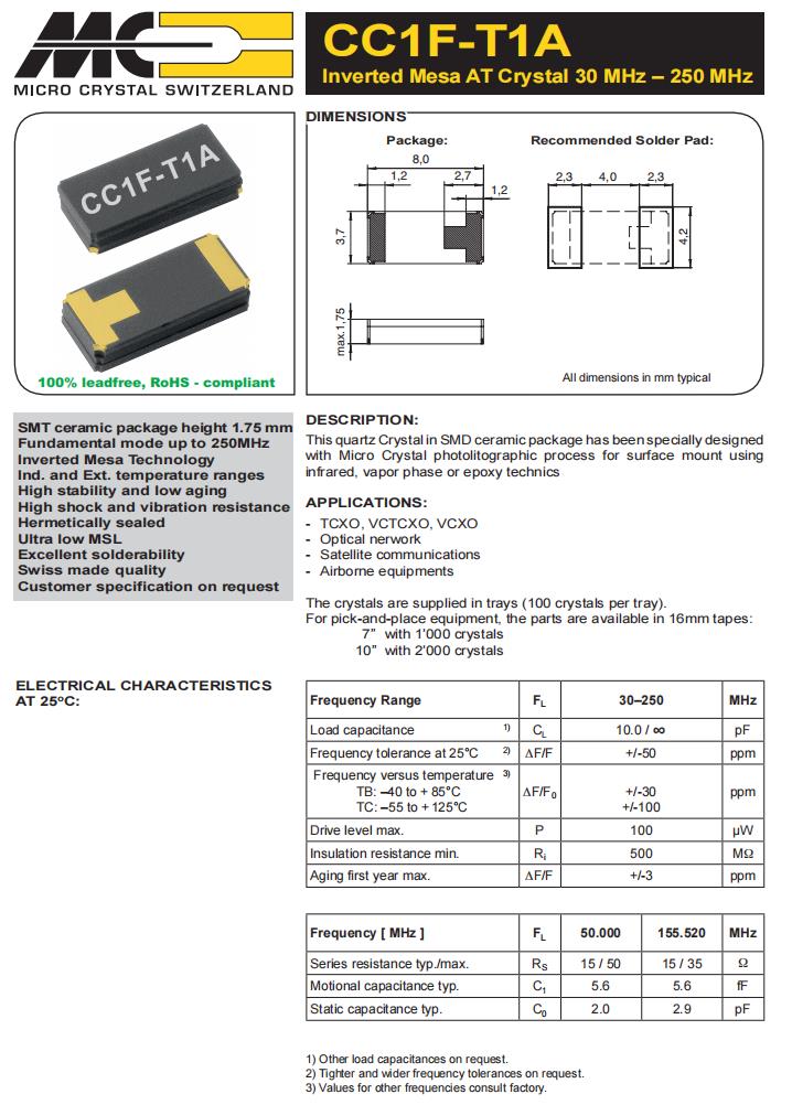 CC1F-T1A-106.250MHz-10.0pF-50ppm-TB-QI|耐高溫晶振|6G通信晶振,Micro石英晶振,CC1F-T1A無源晶振,CC1F-T1A-106.250MHz-10.0pF-50ppm-TB-QI晶振,8037mm貼片晶振,頻率106.25MHz,負載10pf,頻率穩(wěn)定性50ppm,工作溫度-40~125°C,耐高溫晶振,抗沖擊晶振,6G通信晶振,遙感勘測晶振,光學(xué)網(wǎng)絡(luò)晶振,機載設(shè)備晶振,保健和醫(yī)療設(shè)備晶振.