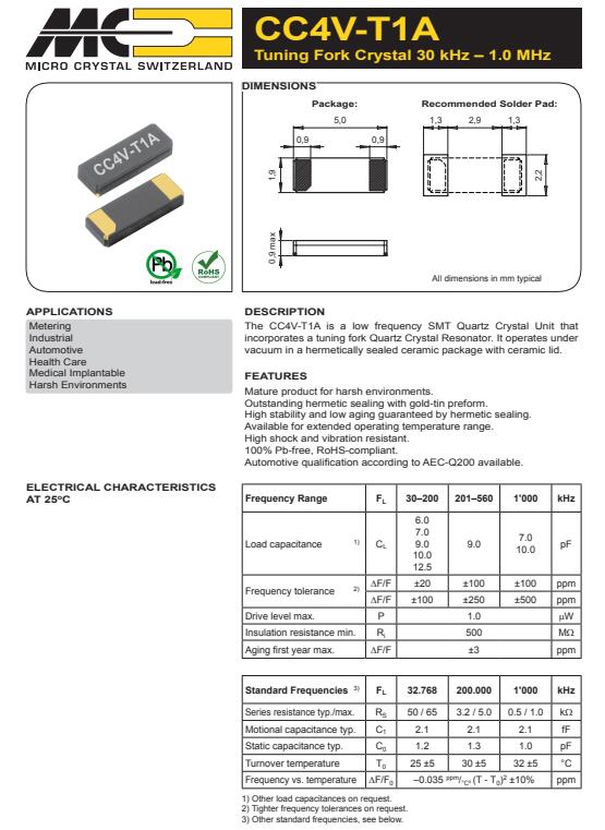 CC4V-T1A-32.768kHz-12.5pF-20ppm-TA-QC,5019mm石英晶振,6G以太網晶振規(guī)格表