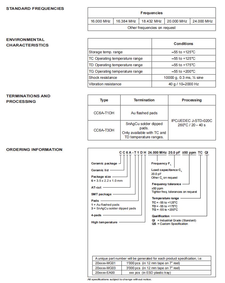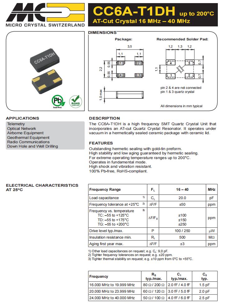 CC6A-T1DH-24.000MHz-20.0pF-50ppm-TC-QI|6G無線電通信晶振|耐高溫晶振,Micro晶振,CC6A-T1DH是一種高頻SMT石英晶體單元,CC6A-T1DH-24.000MHz-20.0pF-50ppm-TC-QI晶振,適用于高達(dá)200°C的極端工作溫度范圍,頻率24MHz,負(fù)載20pf,頻率穩(wěn)定性100ppm,工作溫度-55~125°C,耐高溫晶振,高穩(wěn)定性晶振,6G無線電通信晶振,遙感勘測晶振,地?zé)嵩O(shè)備應(yīng)用晶振,井下和鉆井設(shè)備應(yīng)用晶振.