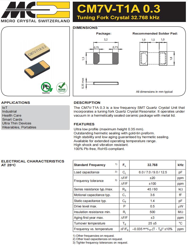 | CM7V-T1A-Low-ESR-32.768k-7pF-10-TB-QA | Micro Crystal | 晶體 32.768 kHz 7.0 pF +/-10 PPM LOW ESR |