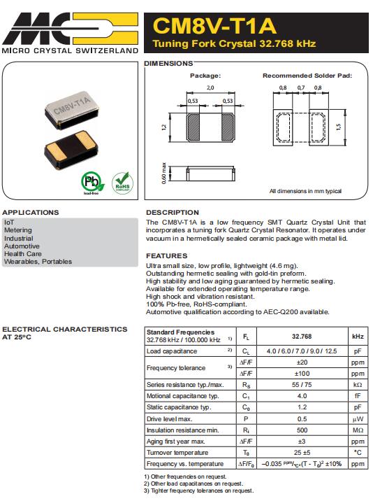 | CM7V-T1A-32.768kHz-12.5pF-100PPM-TA-QC | Micro Crystal | 晶體 32.768 kHz 12.5 pF +/-100 PPM -40/+85C |