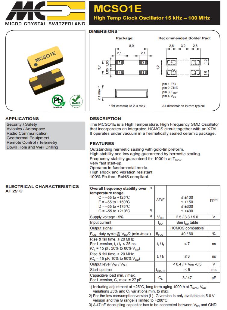 MCSO1ECHV-C-40.000MHz-E/D-T3|耐高溫晶振|6G基站晶振,Micro晶振,MCSO1E石英晶體振蕩器,MCSO1ECHV-C-40.000MHz-E/D-T3晶振,8037mm晶振,貼片石英晶振,頻率40MHz,電壓3.3V,頻率穩(wěn)定性100ppm,工作溫度-55~125°C,耐高溫晶振,高抗沖擊晶振,抗振動晶振,6G基站晶振,安全設備晶振,無線電通信晶振,地熱設備晶振,遙測設備晶振,井下和鉆井設備晶振.
