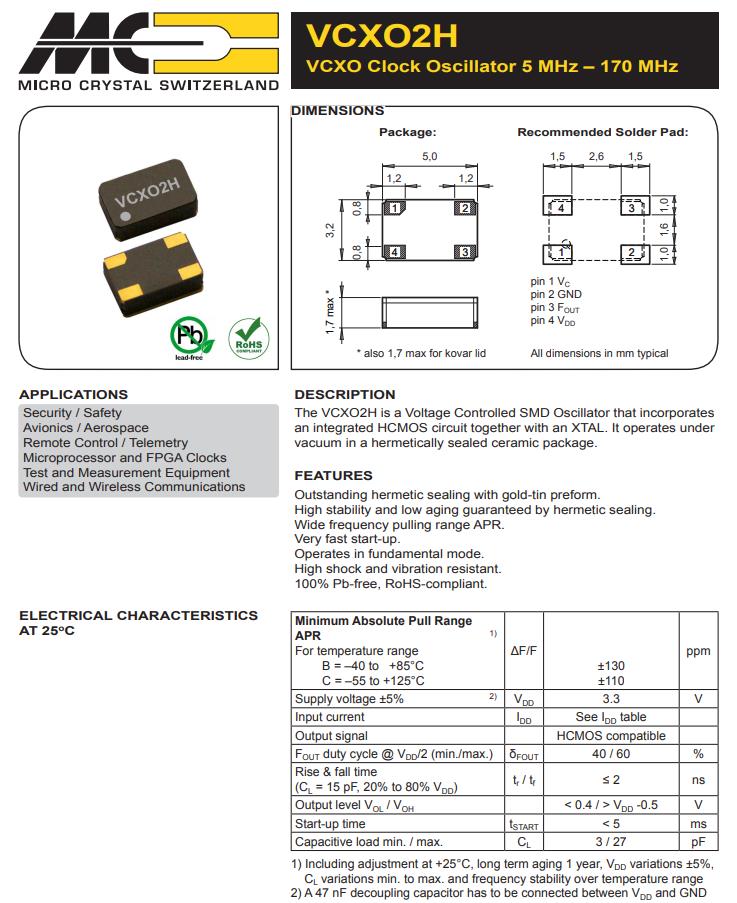 VCX02HV-B-100.000MHz-T3,VCXO晶振,6G無線通信晶振,瑞士微晶晶振,VCX02H有源晶振,VCX02HV-B-100.000MHz-T3晶振,VCXO晶振,5032mm晶振,頻率100MHz,電壓3.3V,頻率穩(wěn)定性130ppm,工作溫度-40~85°C,無鉛環(huán)保晶振,高品質(zhì)晶振,6G無線通信晶振,安全設備晶振,有線通信晶振,航空航天晶振.