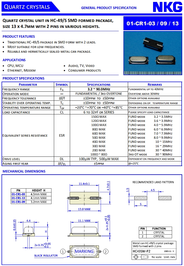 NKG晶振|01-CR3-03-22M1184-T18-2030E-EXT|HC-49S貼片晶振規(guī)格表
