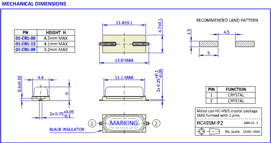 NKG晶振|01-CR3-03-22M1184-T18-2030E-EXT|HC-49S貼片晶振尺寸圖