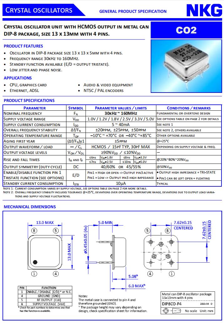 NKG Crystal|CO2-5-B-10.2400-WNS-EXT|正方形鐘振,NKG晶振,CO2正方形鐘振,進口有源晶振,CO2-5-B-10.2400-WNS-EXT晶振,石英振蕩器,四腳插件晶振,13 x 13 x 5mm四腳插件封裝,支持待機功能,頻率10.24MHz,電壓3.3V,負載15pF,工作溫度-40~85°C,頻率穩(wěn)定性50ppm,低抖動晶振,高品質(zhì)晶振,抗震動晶振,專業(yè)視頻設(shè)備晶振,以太網(wǎng)晶振,CPU顯卡晶振,PAL編碼器晶振.