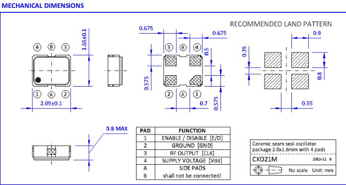 ●SMD封裝尺寸為2.0 x 1.6 x 0.8mm,帶有4個襯墊