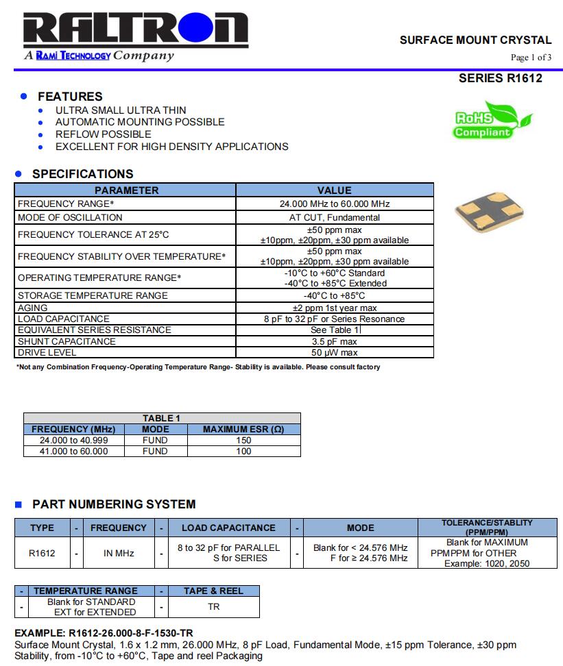 Raltron晶振,R1612-25.000-9-F-1010-TR,6G模塊晶振規(guī)格表