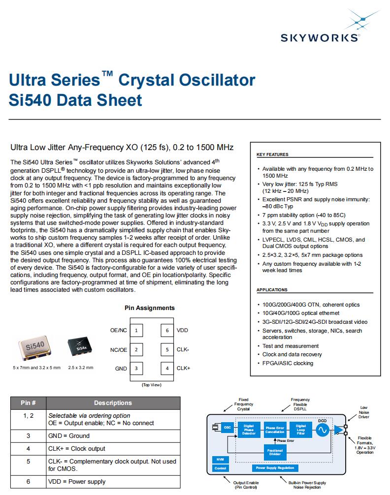 | 540BBA100M000BBG | Skyworks Solutions Inc. | Ultra™ Si540 | 100 MHz | LVDS | 1.8V, 2.5V, 3.3V | ±10ppm |