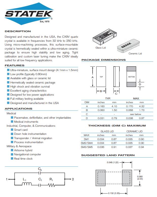 STATEK晶振將水晶放置玻璃封裝以及陶瓷蓋封裝內(nèi),人造水晶相較于其他使用機械生產(chǎn)的水晶要小的多.所生產(chǎn)水晶元件具有領先優(yōu)勢,具有以下特點:高穩(wěn)定性,頻率精準,保存溫度范圍廣,抗老化性能強等特點.Statek石英晶振,晶體振蕩器具有小型化,低功耗,優(yōu)秀的耐沖擊性,抗氧化性佳等特點.廣泛使用于全球GPS定位系統(tǒng),WLAN網(wǎng)絡產(chǎn)品,網(wǎng)絡控制器,無線基站,程控交換設備,精密儀器,GPS衛(wèi)星,汽車應用,計算機,全球GPS定位系統(tǒng),無線通訊,數(shù)碼產(chǎn)品等等.