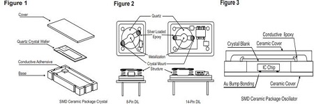 石英晶體單元包括一小條石英帶或一盤石英,根據(jù)用戶指定的諧振頻率,將其加工成確切的尺寸和厚度.石英鍍有導(dǎo)電電極,并安裝在密封的保護(hù)罩中(見圖1).電極通過玻璃對(duì)金屬的密封或通過SMD陶瓷封裝(見圖1)連接到穿過基座的引線.電極通過鍍層陶瓷連接到焊盤.晶體單元通常與其他電路封裝在一起,以實(shí)現(xiàn)功能齊全的模塊,例如石英晶體振蕩器或復(fù)數(shù)濾波器.圖2和圖3說明了簡(jiǎn)單的晶體振蕩器.由于晶體單元的性質(zhì),正確處理非常重要. 機(jī)械沖擊