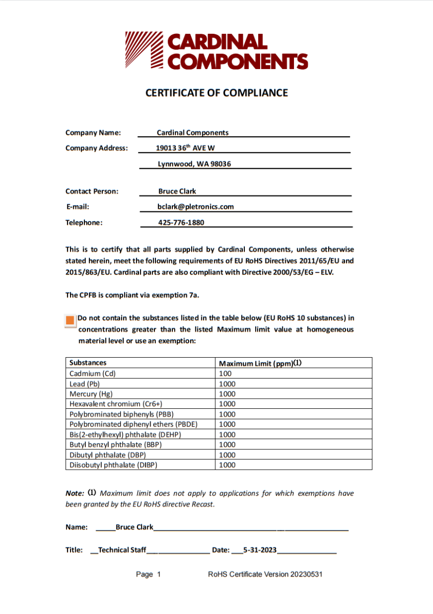 除非本協(xié)議另有說明,否則基本部件提供的所有部件均符合歐盟RoHS指令2011/65/EU和2015/863/EU的以下要求?;静考卜现噶?000/53/EG-ELV。Cardinal晶振不含下表所列物質(zhì)(EU RoHS 10物質(zhì))的濃度大于均質(zhì)材料水平上所列的最大限值。