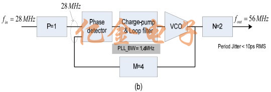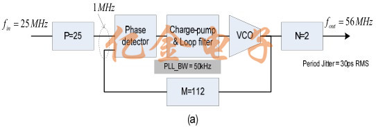 設(shè)計a需要較大的P值,從而產(chǎn)生一個帶寬為50kHz(由公式3計算)并且抖動為30ps,這超出了規(guī)范.設(shè)計b利用頻率程序-能夠選擇允許的輸入頻率預(yù)分頻比為1,產(chǎn)生PLL帶寬為1.4MHz.抖動小于10ps rms,符合規(guī)定的要求.
