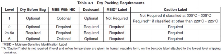 JEDEC J-STD-033:J-STD-033的目的是為SMD制造商和用戶提供標(biāo)準(zhǔn)化方法,用于處理,包裝,運(yùn)輸和使用已經(jīng)過濕氣/回流敏感的SMD封裝分類到J-STD-020中定義的水平.J-STD-033中列出的MSL水平根據(jù)J-STD-020確定.