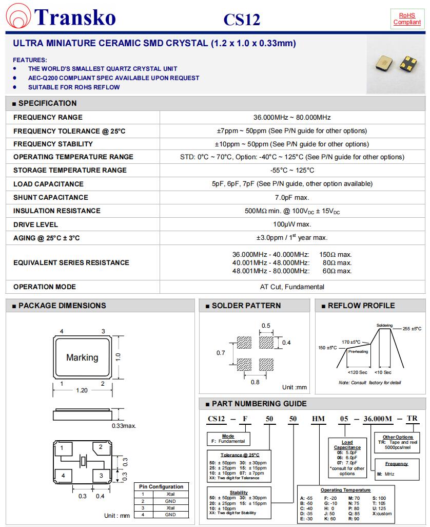 Transko晶振,CS12-F3030EQ06-40.000M-TR,6G光纖通道晶振,Transko晶振,歐美進(jìn)口晶振,CS12無源晶振,石英晶體諧振器,CS12-F3030EQ06-40.000M-TR晶振,1210mm晶振,四腳貼片晶振,頻率40MHz,負(fù)載6pF,頻率公差30ppm,工作溫度-30~85°C,超小型晶振,耐高溫晶振,6G光纖通道晶振,GPS導(dǎo)航應(yīng)用晶振,通訊設(shè)備晶振,便攜式設(shè)備晶振.