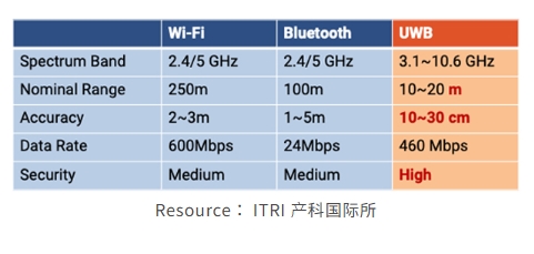 UWB 的頻譜范圍在 3.110.6 GHz,遠(yuǎn)超 WiFi 和藍(lán)牙的 2.45 GHz 范圍。 由于運(yùn)行在更高的頻率范圍內(nèi)并具有更多的帶寬,UWB 能夠傳輸更多的數(shù)據(jù),使其成為高速度短距離數(shù)據(jù)傳輸?shù)睦硐脒x擇。 UWB 的精確度達(dá)到 1030 厘米,遠(yuǎn)超 WiFi (23 米) 和藍(lán)牙 (1~5 米)。