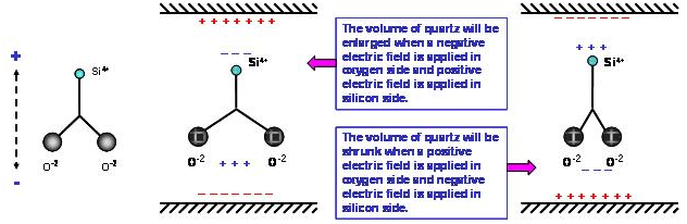 石英材料中的二氧化硅分子(SiO2) 在正常狀態(tài)下, 其電偶極是互相平衡的電中性. 在(圖二左)的二氧化硅是以二維空間的簡化圖形. 當我們在硅原子上方及氧原子下方分別給予正電場及負電場時, 空間系統(tǒng)為了維持電位平衡, 兩個氧原子會相互排斥, 在氧原子下方形成一個感應正電場區(qū)域, 同時在硅原子上方產生感應負電場區(qū)域. 相反的情況, 當我們在硅原子上方及氧原子下方分別給予負電場及正電場時, 兩個氧原子會相互靠近, 氧原子下方產生感應負電場,硅原子上方產生感應正電場.