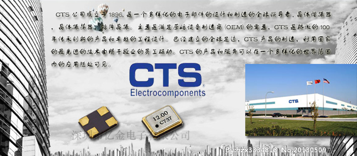 CTS是一家專業(yè)石英頻率控制元件制造商.主要產(chǎn)品包括『石英振蕩子』、『石英振蕩器』、『壓控石英振蕩器』、『溫度補(bǔ)償石英振蕩器』技術(shù)的制造商,完整的產(chǎn)品線提供一次性購足的服務(wù).產(chǎn)品主要面向為國內(nèi)通信,衛(wèi)星導(dǎo)航,GPS,車載多媒體,電腦主板,筆記本,電子數(shù)碼選擇應(yīng)用領(lǐng)域