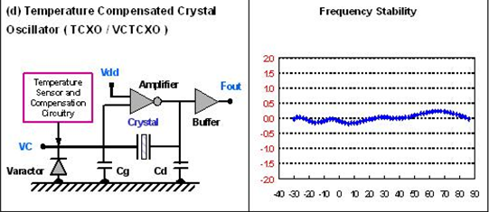 為了滿足應(yīng)用面需求而言, 石英晶體振蕩器內(nèi)部的振蕩線路有以基本波或三倍頻不同方式. 若要達(dá)到數(shù)佰兆赫的輸出頻率時, 振蕩線路后級可以采用鎖相回路方式或倍頻方式, 將較低頻率的石英振蕩頻率提升. 對于輸出端的輸出準(zhǔn)位及輸出波形也有各類不同需求,如CMOS, LVPECL, LVDS…..等. 這些規(guī)格都要仔細(xì)的定義.在(如圖)提供了數(shù)種石英振蕩器輸出頻率對溫度變化的穩(wěn)定性示義圖.