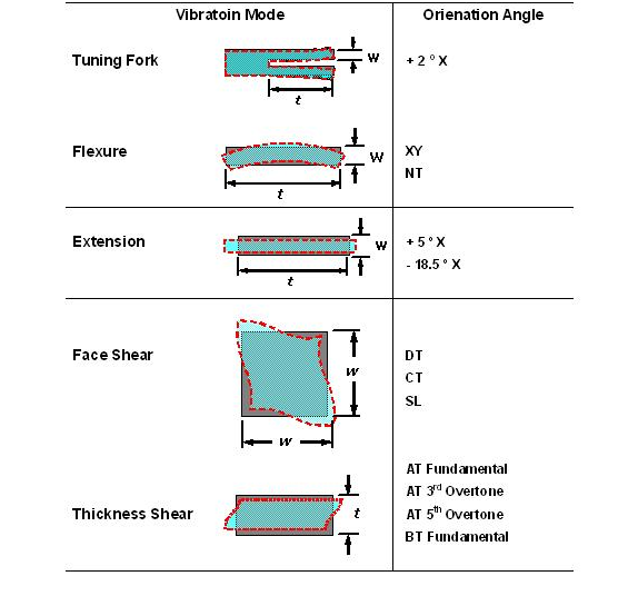 經(jīng)由不同的石英切割角度及不同電極型狀的電場(chǎng)效應(yīng), 石英芯片展現(xiàn)了各種不同的振動(dòng)模態(tài). 以經(jīng)常產(chǎn)生的振動(dòng)模態(tài)可以概分為擾曲模態(tài)(flexure mode), 伸縮模態(tài)(extension mode), 面剪切模態(tài)(face shear mode) 和 厚度剪切模態(tài)(thickness shear mode). 這幾種振動(dòng)模態(tài)以簡(jiǎn)單的方法在表一中可以看到. 在實(shí)際狀況中, 石英芯片并不是一定祇有單一種振動(dòng)模態(tài), 而可能有多種模態(tài)同時(shí)存在在一個(gè)石英芯片的振蕩中, 經(jīng)由適當(dāng)?shù)脑O(shè)計(jì), 可以壓制其它不希望產(chǎn)生的振動(dòng)模態(tài)(unwanted mode), 來(lái)達(dá)到主要振動(dòng)模態(tài)的最佳化.