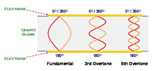 基本波振蕩及倍頻振蕩模態(tài)( Fundamental and Overtone Vibrations Mode):在AT切割角度的石英晶體共振子主要是以厚度剪切振蕩模態(tài)存在. 石英晶體在共振時, 除了基本波振蕩之外, 高階的倍頻共振也與基本波振蕩同時存在于石英晶體的電極區(qū)域之間. 但是, 由于壓電材料的電極是電氣相位相反的振動環(huán)境, 所以, 祇有奇數(shù)倍(odd number)的高頻倍頻可以發(fā)生, 偶數(shù)倍(even number)的倍頻共振在石英晶體共振子是不會存在的.