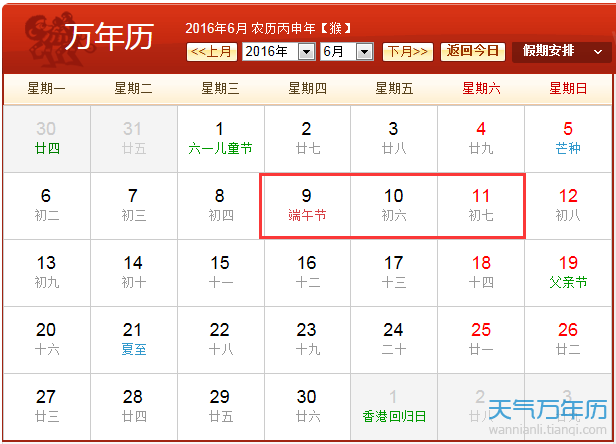 6月9日至6月11日,共計(jì)3天.6月12日(星期日)正常上班.
