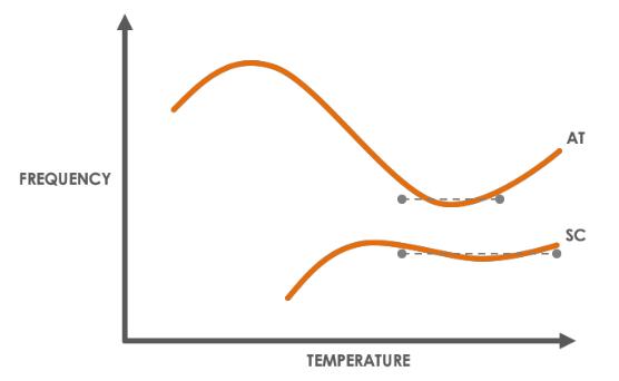 • 更高的工作溫度:SC 切割晶體的轉(zhuǎn)折點(diǎn)高于 AT 切割晶體,使其成為烘箱應(yīng)用的理想選擇。這種較高轉(zhuǎn)折點(diǎn)的缺點(diǎn)是在較低溫度下急劇下降。由于這一特性,SC 切割晶體僅適用于恒溫振蕩器,在其他振蕩器配置(TCXO、VCXO 等)中無(wú)法正常工作。