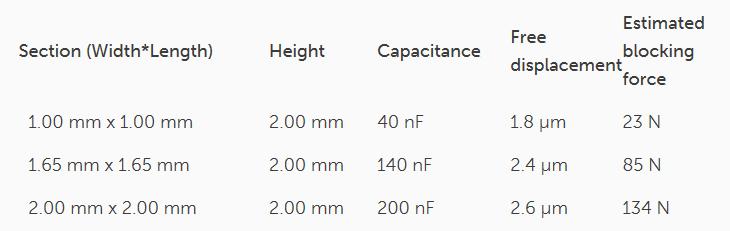 CTS 丹麥高級研發(fā)工程師 Charles Mangeot 先生表示:“由于高密度封裝導(dǎo)致致動機(jī)構(gòu)可用空間更小,業(yè)界正在推動更小的壓電致動器。但是小型化對電氣驅(qū)動和安全性造成了限制,因此低電壓操作通常是一個挑戰(zhàn)。我們過去曾生產(chǎn)過小型執(zhí)行器,但通過集中精力改進(jìn)設(shè)計和工藝,CTS 現(xiàn)在能夠更有效地制造此類產(chǎn)品,并將其提供給廣泛的應(yīng)用和客戶。我們努力突破我們產(chǎn)品的界限,為壓電多層執(zhí)行器提供新的應(yīng)用。” 規(guī)格
