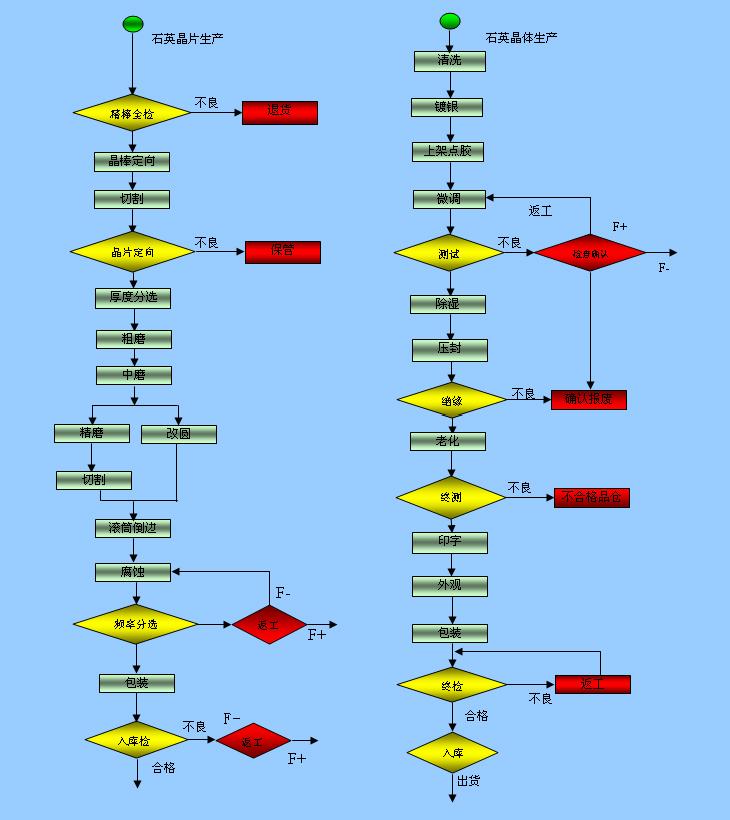 下面對照右邊圖石英晶體生產(chǎn)幾項重點做簡單介紹.一、晶體的焊接:現(xiàn)在大部分工廠為了提高工作效率對于貼片式石英晶振都采用自動化貼片機,在焊接時要確保溫度不能過高否則會破壞晶體特性還要再三確定安裝溫度和時間,安裝時切記不能用鑷子和硬件工具夾具也不能直接接觸IC表面.二、溫度特性:一般正常最理想的溫度為:+15°C 至 +35°C,濕度 25 % RH 至 85 % RH不能過高也不能過低.三、晶體的老化:老化就像人的年齡隨著歲月的而不斷的增加人體健康也大不如青少年勞動能力也逐漸下降,晶振老化大概意思也一樣產(chǎn)品用久了材料和特性會發(fā)生微小變化,現(xiàn)在對于要求老化率達到年老化以前的日老化幾天或者十幾天就可以完成,測量老化率也要在一定的溫度范圍下現(xiàn)在國家規(guī)定對老化鑒定條件是:85℃,30天.四、鍍薄前后應(yīng)考慮烘箱里能充氮氣:在鍍薄前要進行離開轟擊清洗而后上架點膠再微調(diào)進行高溫烘烤,以達削除應(yīng)力的影響.為了防止氧化晶振殼內(nèi)部也要充高純度氮氣.五、檢測:成品測試于檢測部人工逐個測試,也有大部分工廠用機器篩選但是這樣并不能達到精確效果,出到客戶手中可能會有大部分不良為了避免減小不良量億金采用人工檢測,六、產(chǎn)品包裝:在包裝時必須要保證密封性好,若是包裝漏氣里面的石英晶體產(chǎn)品容易與空氣里的氧氣接觸從而產(chǎn)生氧化最終導(dǎo)致上不了錫.