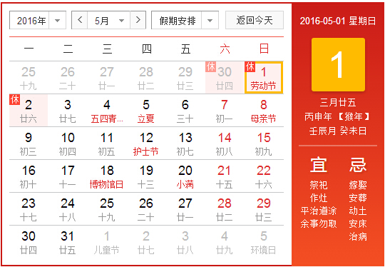 一、放假時(shí)間4月30日至5月2日(星期六至星期一)放假,共3天.與4月30日(周六)、5月1日(周日)為公休日,5月2日(周一)為調(diào)休日.