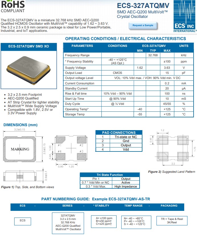 ECS-327ATQMV是一款32.768kHz低功耗、符合AEC-Q200標(biāo)準(zhǔn)的multi volt SMD石英晶體振蕩器。緊湊型陶瓷封裝3.2x2.5x0.9毫米(LWH)采用工業(yè)標(biāo)準(zhǔn)尺寸。MultiVolt特性允許客戶將同一器件用于多種設(shè)計(jì),降低認(rèn)證要求,并減少庫(kù)存。ECS-327ATQMV是微型32.768kHz SMD AEC-Q200合格的HCMOS振蕩器,MultiVolt能力為1.62~3.63V。3.2x2.5x0.9mm陶瓷封裝非常適合低功耗/便攜式、工業(yè)和物聯(lián)網(wǎng)應(yīng)用。
