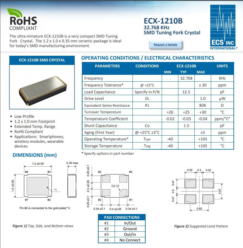 這款貼片晶振的料號(hào)為ECX-1210B,從型號(hào)可以看出改產(chǎn)品小體積的特性,因?yàn)楹芏嗑д駨S商的料號(hào)都會(huì)體驗(yàn)出一定的產(chǎn)品信號(hào),比如像KDS晶振公司的DX1008JS石英晶振,它的尺寸就是1008mm.ECS推出這款晶振具有1.2mmx1.0mm的4焊盤尺寸,非常適合對(duì)尺寸至關(guān)重要的可穿戴應(yīng)用.