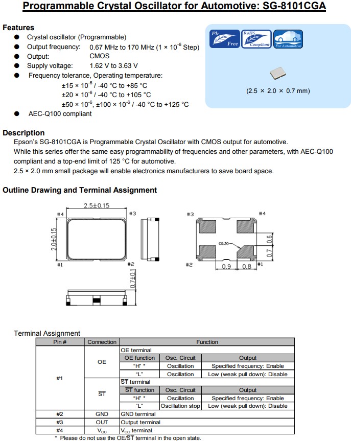 愛普生晶振SG-8101CGA是用于汽車的CMOS輸出可編程晶體振蕩器。 雖然這一系列提供了同樣容易編程的頻率和其他參數(shù),與AEC-Q100符合汽車應(yīng)用的125℃上限。小體積尺寸2.5x2.0mm四腳貼片晶振,小封裝將幫助電子制造商節(jié)省電路板空間,頻率范圍-0.67MHz至170MHz(1ppm步進(jìn)),電源電壓-1.62V至3.63V,功能-輸出使能(OE)或待機(jī)(ST),被廣泛用于汽車電子應(yīng)用,音響、藍(lán)牙、雷達(dá)、時鐘、顯示屏,智能手機(jī),物聯(lián)網(wǎng)等。