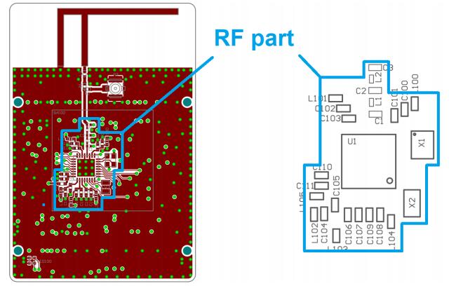 使用EFR32系列2無線MCU的設(shè)計(jì)建議已使用SiliconLabs提供的參考設(shè)計(jì)完成廣泛測(cè)試。建議設(shè)計(jì)者按原樣使用參考設(shè)計(jì),因?yàn)槠淠軌虮M可能減小寄生現(xiàn)象導(dǎo)致或不良元件布置和PCB排線產(chǎn)生的失諧作用。EFR32參考設(shè)計(jì)文件位于SimplicityStudio的“套件文檔”選項(xiàng)卡下。設(shè)計(jì)的緊湊型RF部分(不包括50Ω單端天線)以藍(lán)框圈出,強(qiáng)烈建議使用圈出的RF布局,以避免出現(xiàn)任何可能的失諧作用。下圖顯示了設(shè)計(jì)中圈出的緊湊型RF部分。