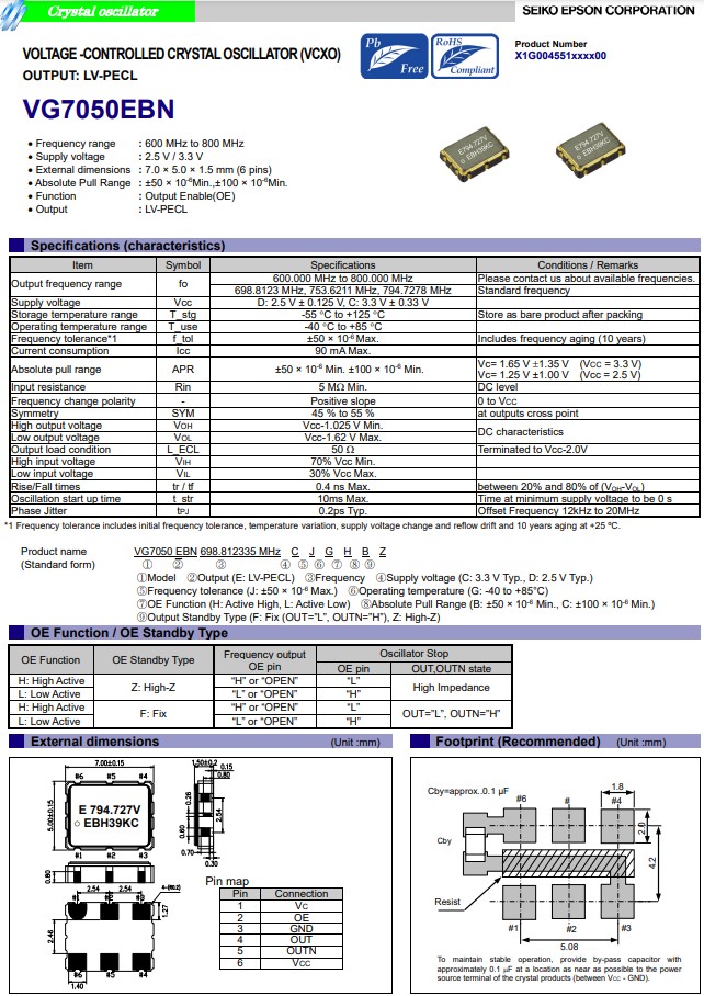 | X1G004551001800 | VG7050EBN | 644.000000MHz | 7.00x5.00x1.50mm | LV-PECL | 2.970 to 3.630 V |