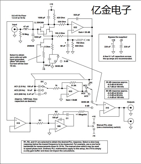 圖1顯示了具有上述功能的完整超低噪聲放大器.輸入電路包括兩個2SK369JFET并聯連接,以實現極低的噪聲電壓.這些令人驚訝的低噪聲晶體管的本底噪聲接近0.7納伏,而在10Hz時噪聲僅升至1.5納伏.JFET和LM833的第一級提供30dB的直流耦合增益.有源晶振顯示的噪聲足以引起該級的削波,因此噪聲很大,可以將增益設置為0dB進行測量!包括第二個30dB放大器,用于交流耦合設置,總交流增益為60dB.通過多極開關選擇三個交流頻率響應.緩沖器驅動兩個BNC連接器,一個用于頻譜分析儀,另一個用于示波器.PLL非常普通,除了在輸入端提供了一個緩沖器,并增加了一個手動”轉換”開關以加快鎖相速度.R1,R2和C1可以與接線柱連接,以方便修改.可以在PLL輸出上添加一個10k電位器,以手動調整各種振蕩器的調諧靈敏度.